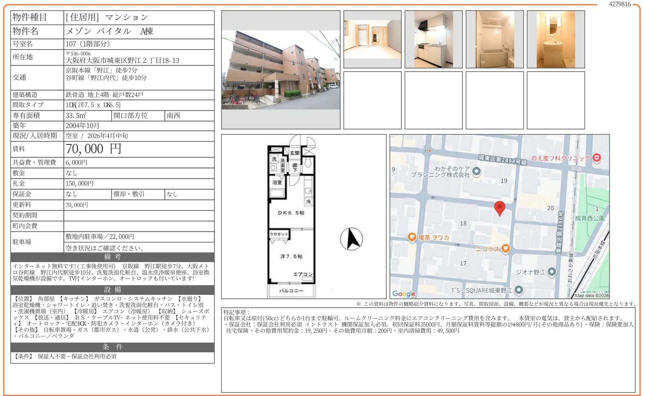 | アクセス | 野江 (徒歩7分) 野江内代 (徒歩10分) |