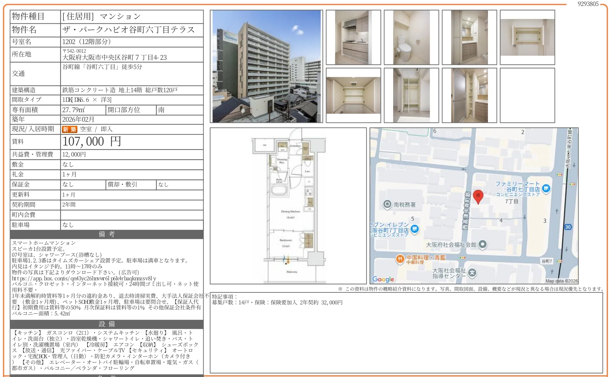 | 物件名 | ザ・パークハビオ谷町六丁目テラス 1202 |