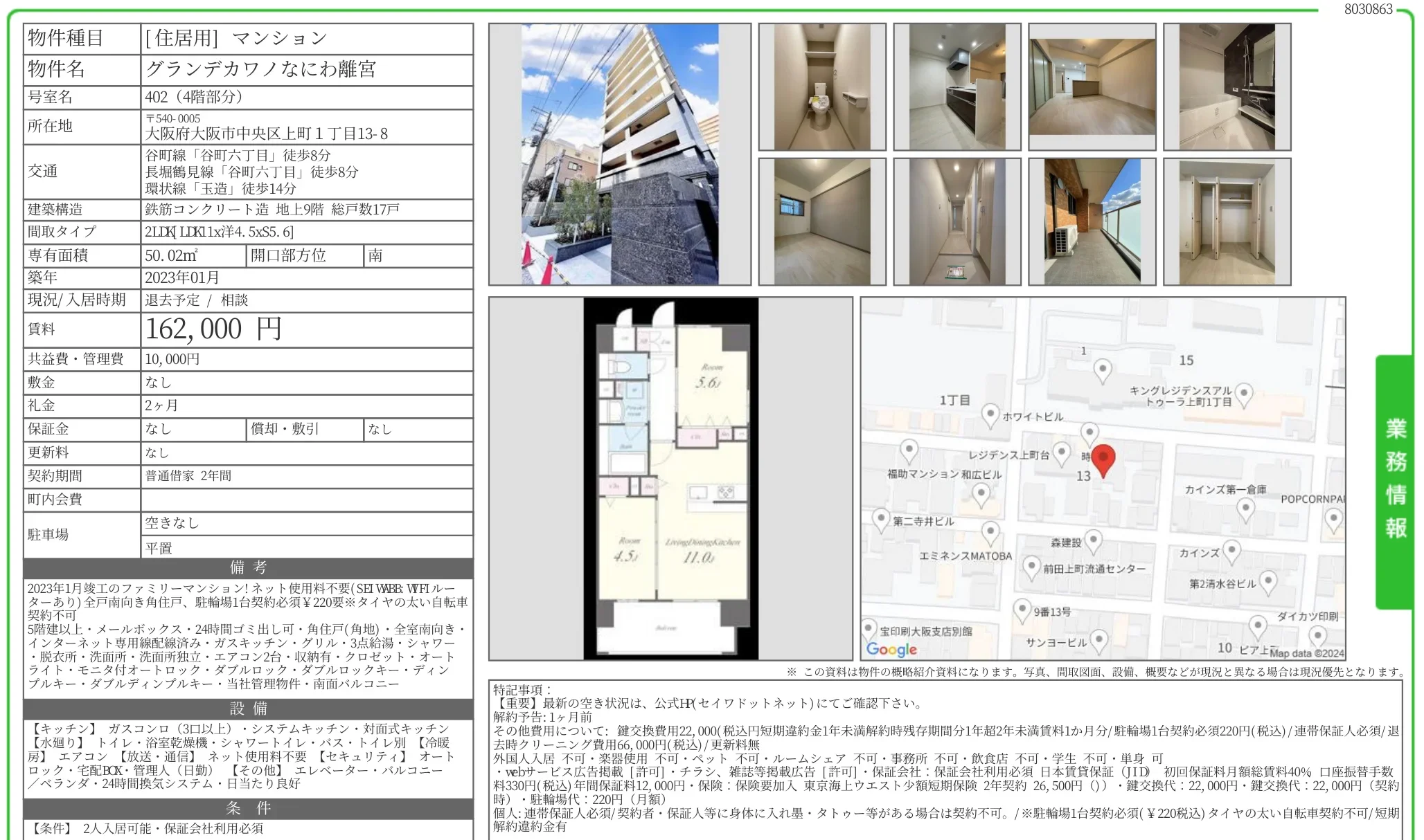 | 物件名 | グランデカワノなにわ離宮 402号 |