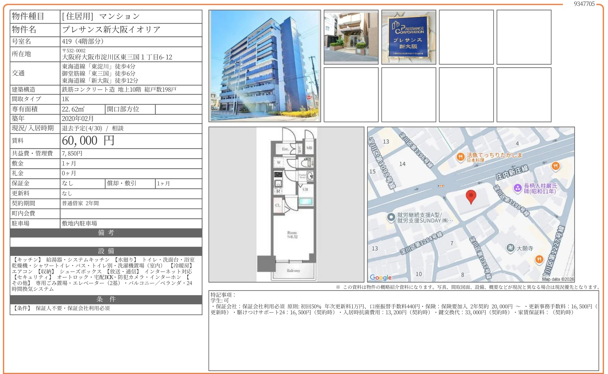 | 物件名 | プレサンス新大阪イオリア 419 |