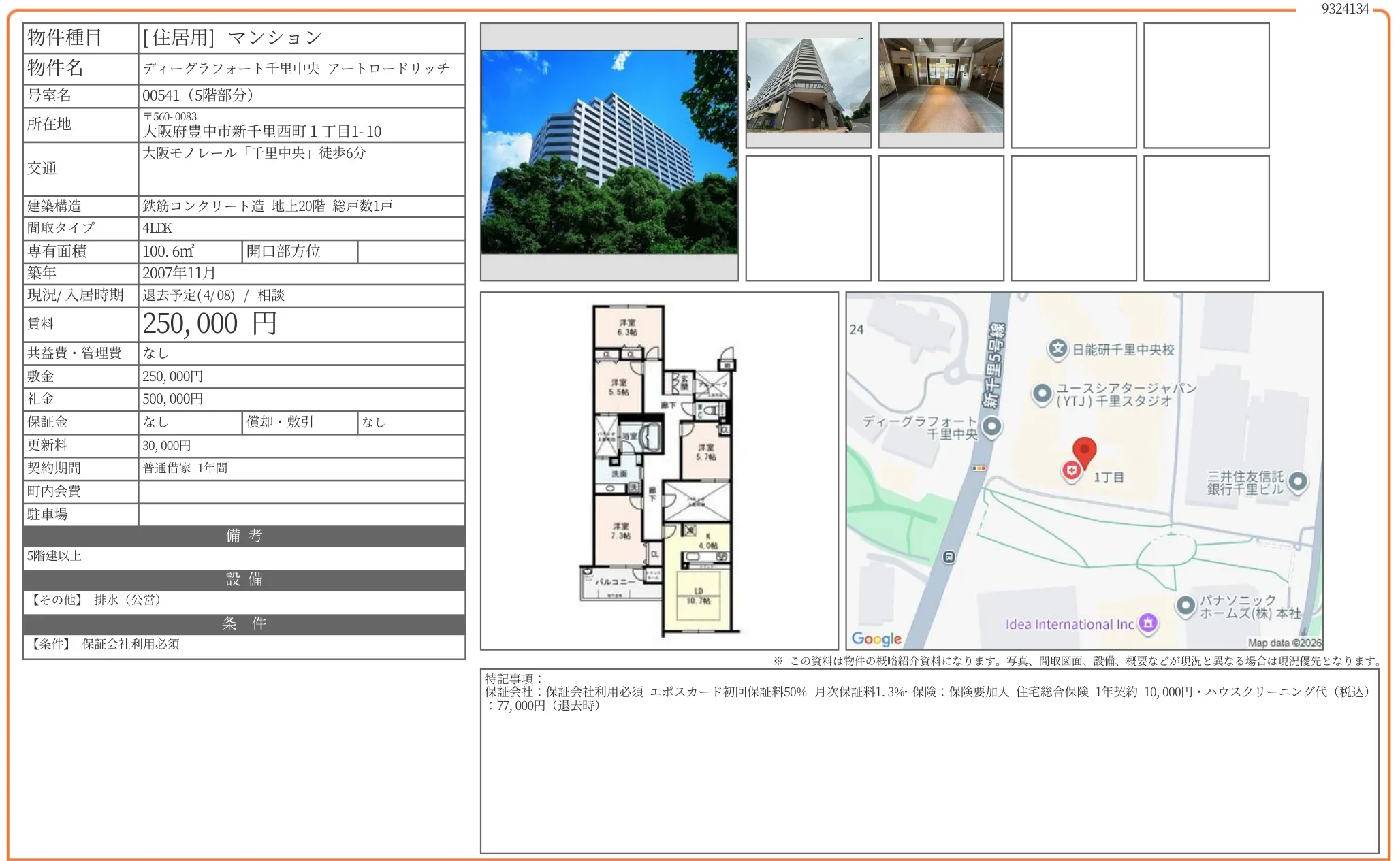 | 物件名 | ディーグラフォート千里中央 アートロードリッチ 00541 |