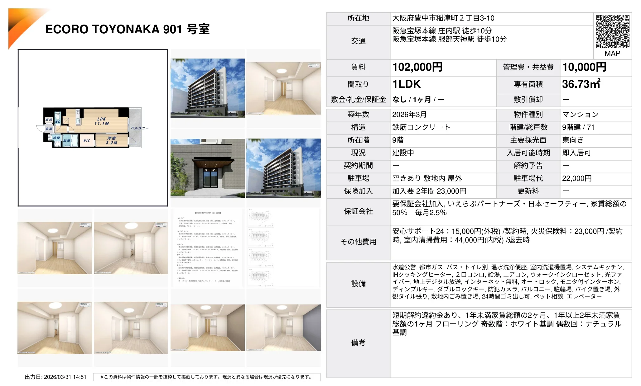 | 物件名 | ECORO TOYONAKA 901 号室 901号 |