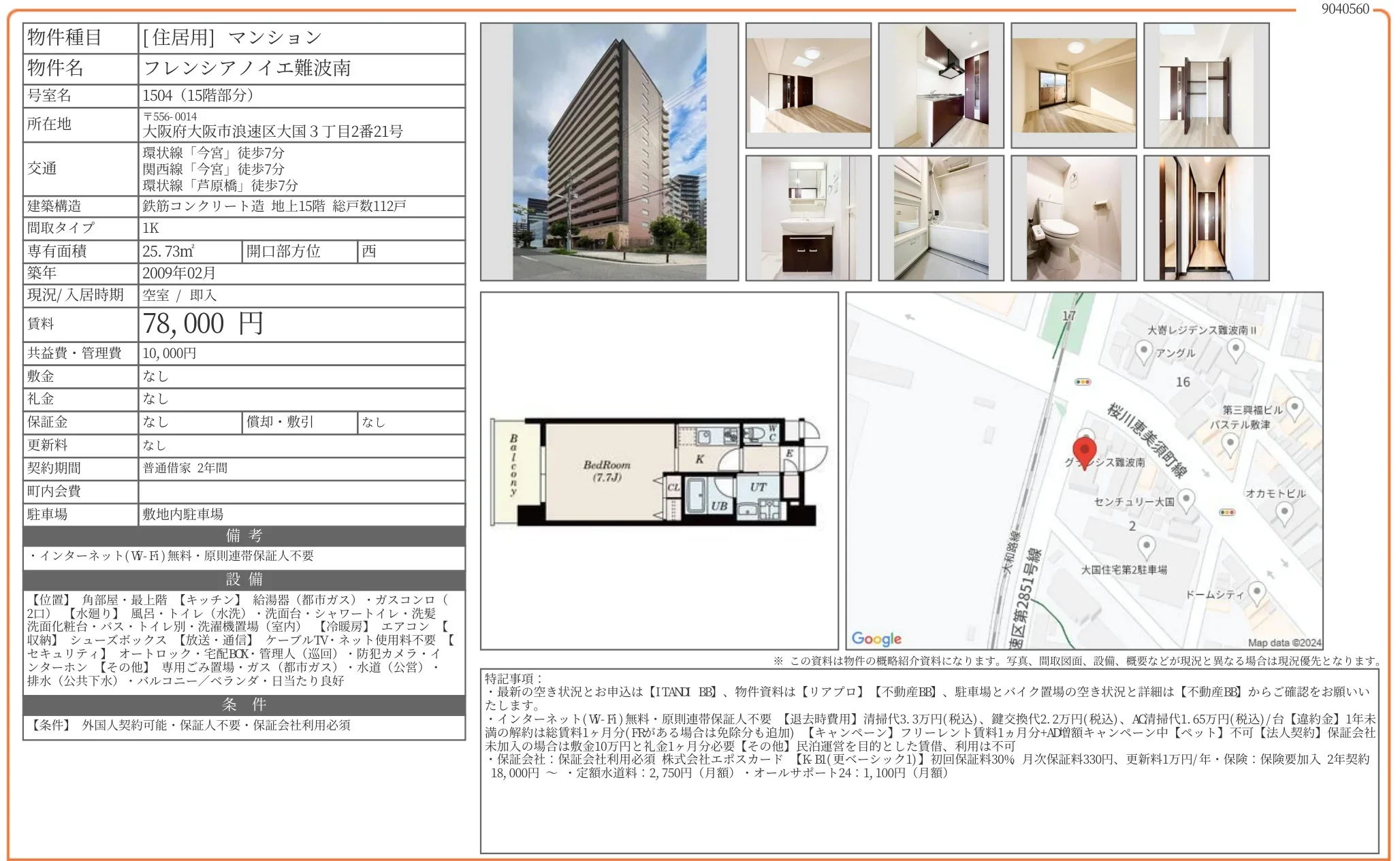 | 物件名 | フレンシアノイエ難波南 1504 |