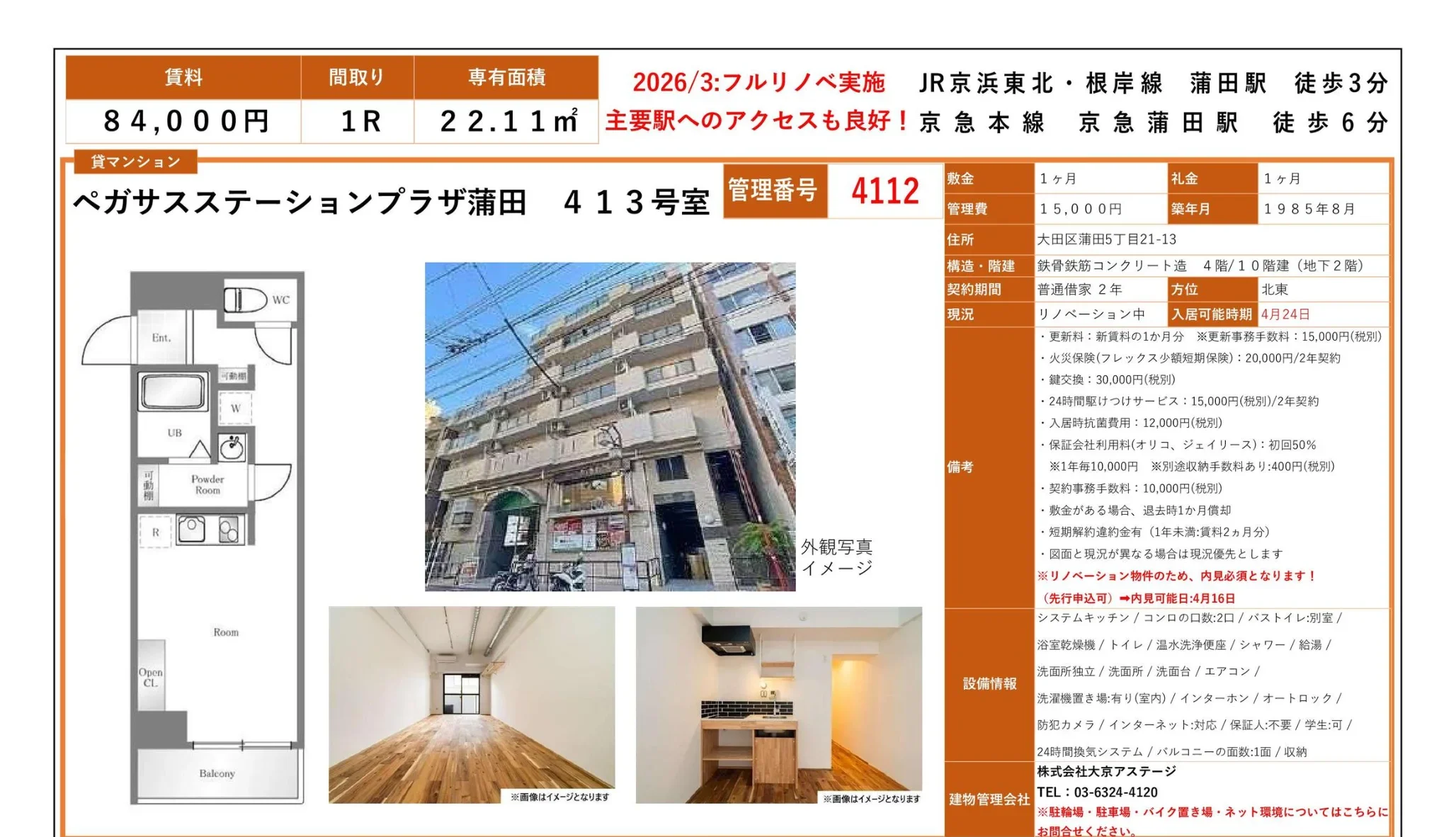 | 物件名 | ペガサスステーションプラザ蒲田 413号 |