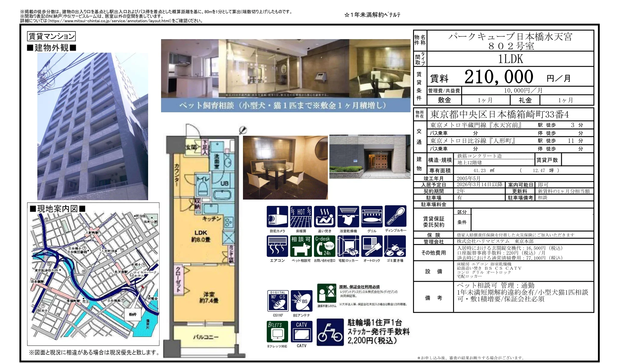 | 物件名 | パークキューブ日本橋水天宮 802号 |