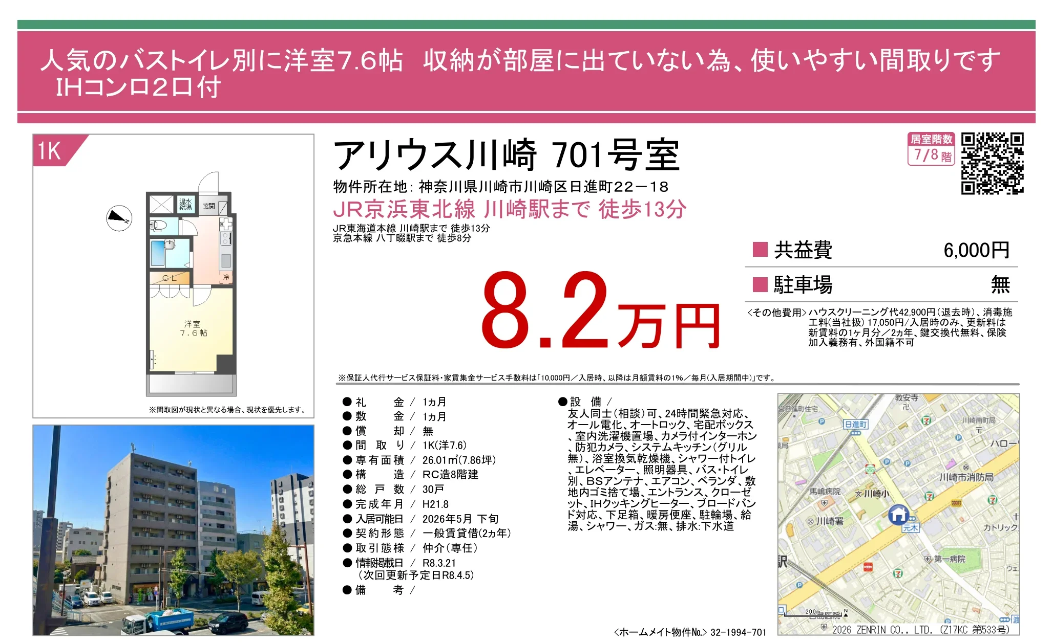 | 物件名 | アリウス川崎 701号室 701号室 |