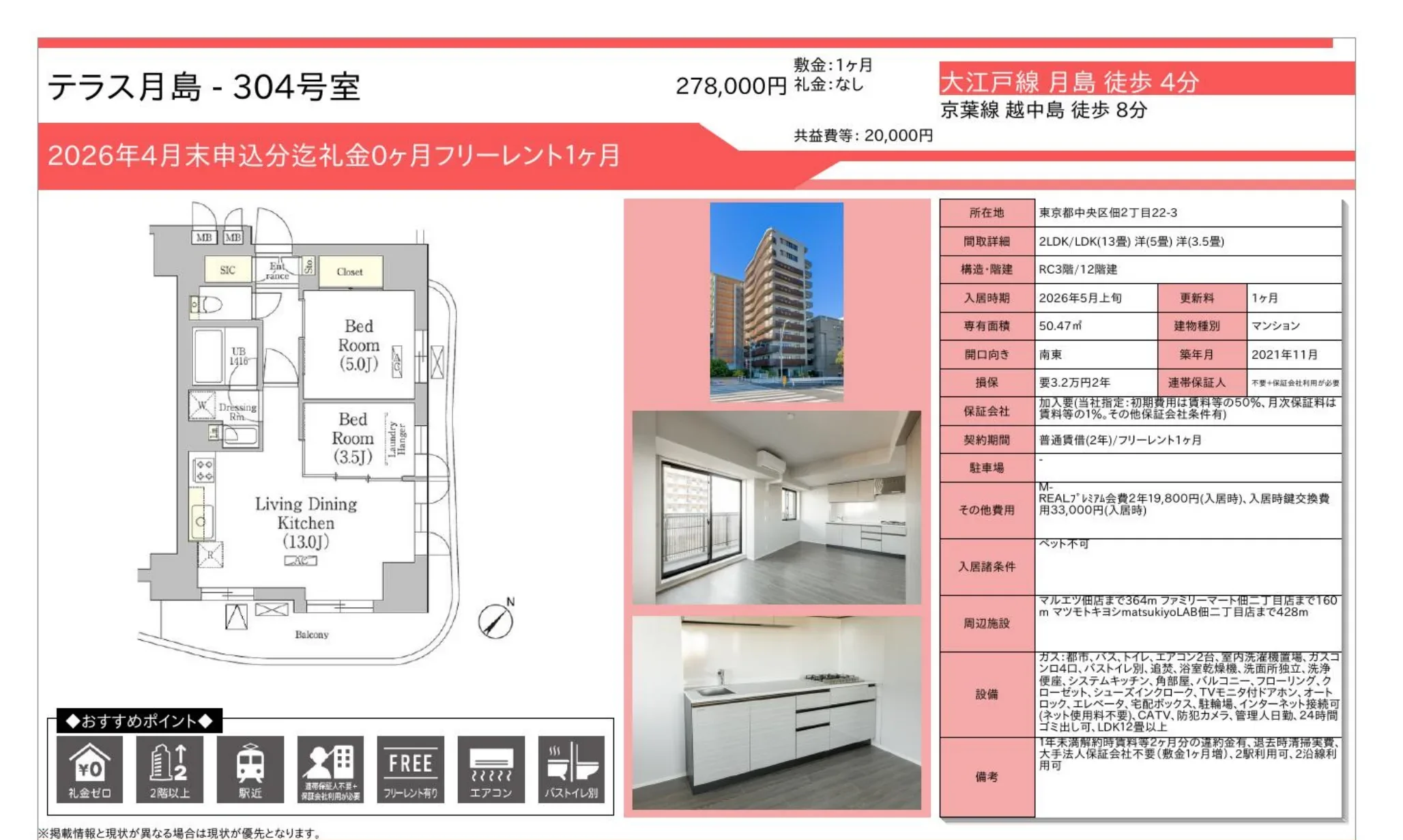 | アクセス | 月島 (徒歩4分) 越中島 (徒歩8分) |