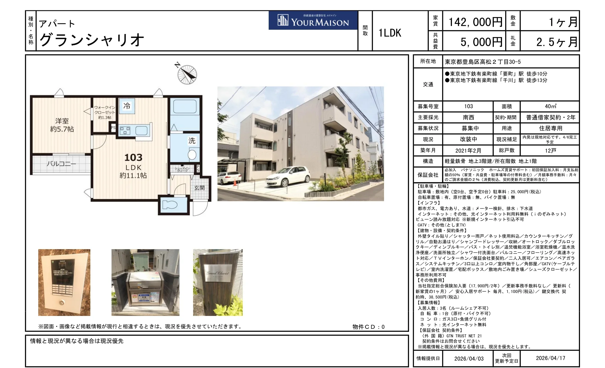| 物件名 | アパートグランシャリオメゾン 103号 |