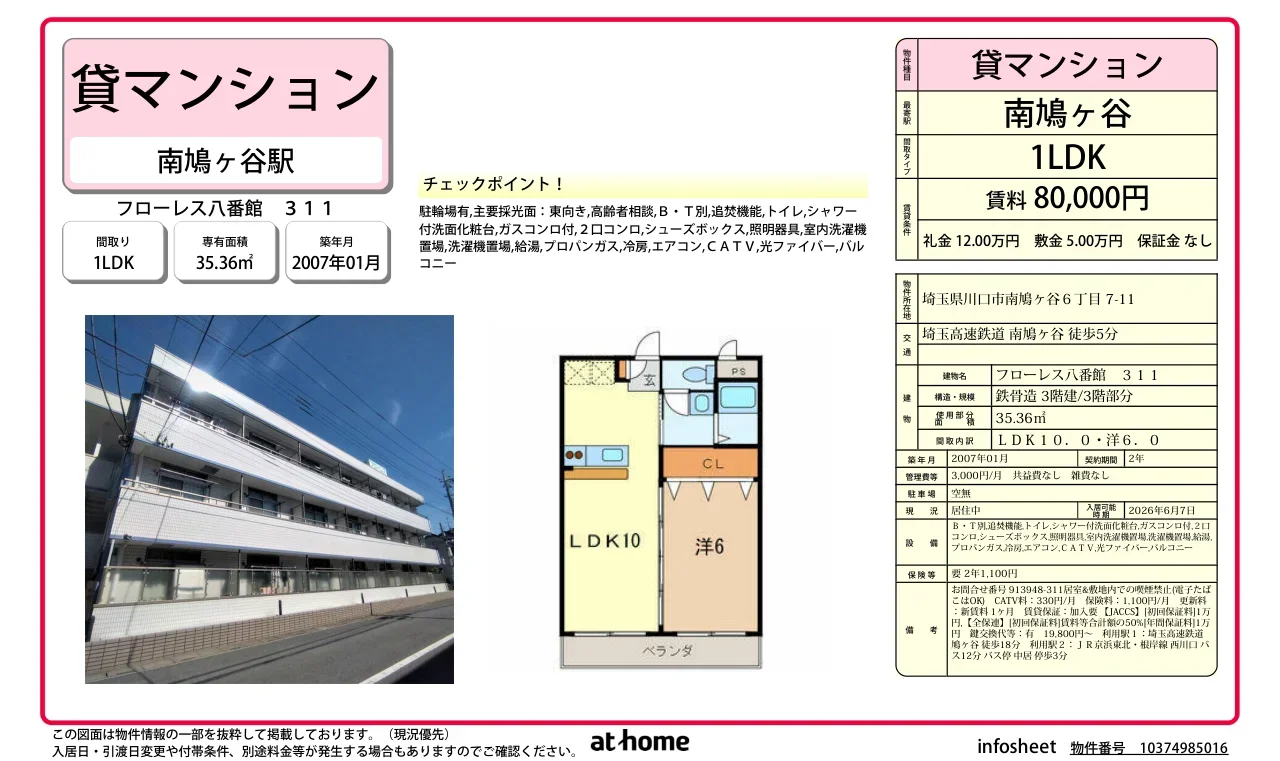 | アクセス | 南鳩ヶ谷 (徒歩5分) 鳩ヶ谷 (徒歩18分) 西川口 |