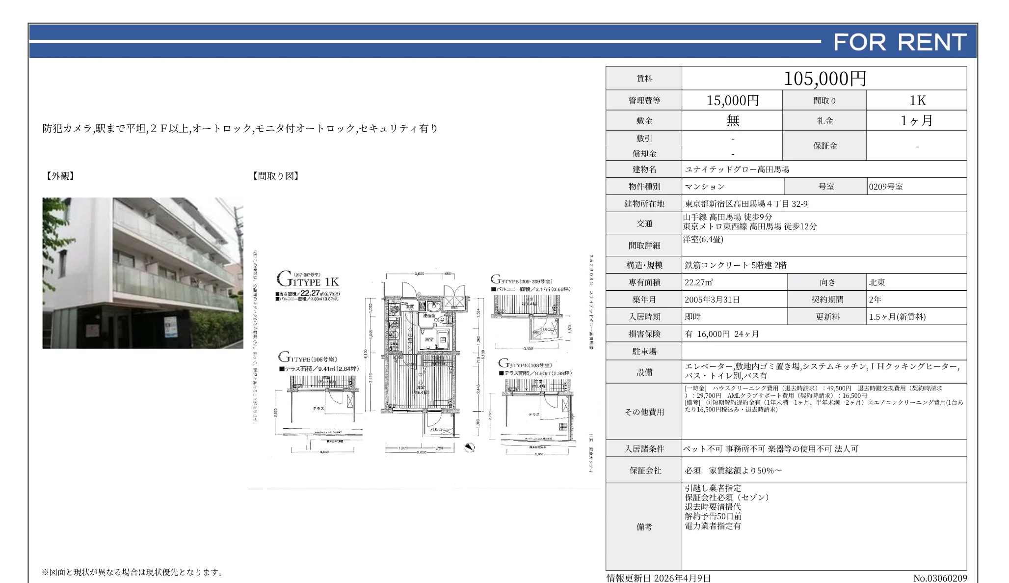 | 物件名 | ユナイテッドグロー高田馬場 0209号 |