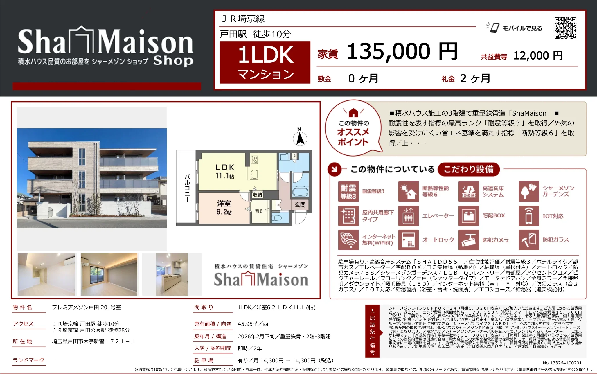 | 物件名 | プレミアメゾン戸田 201号室 201号 |