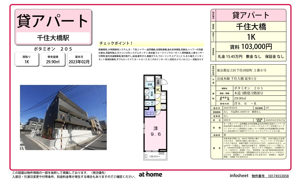 | アクセス | 千住大橋 (徒歩1分) 北千住 (徒歩16分) 牛田 (徒歩22分) |