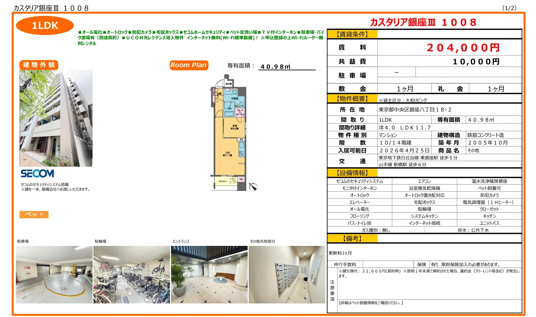 | 物件名 | カスタリア銀座Ⅱ 1008 1008 |