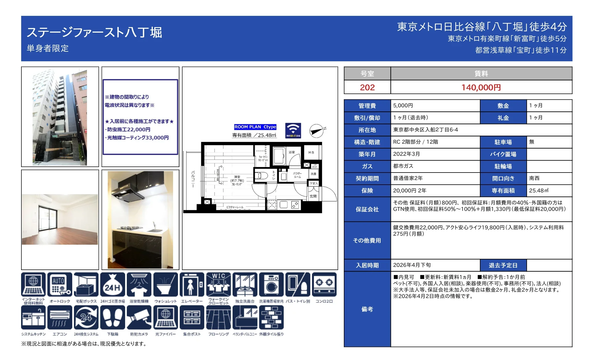 | 物件名 | ステージファースト八丁堀 202号 |