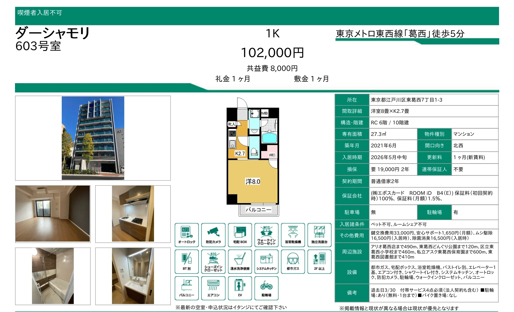 | 引渡時期 | 退去日3/30 |