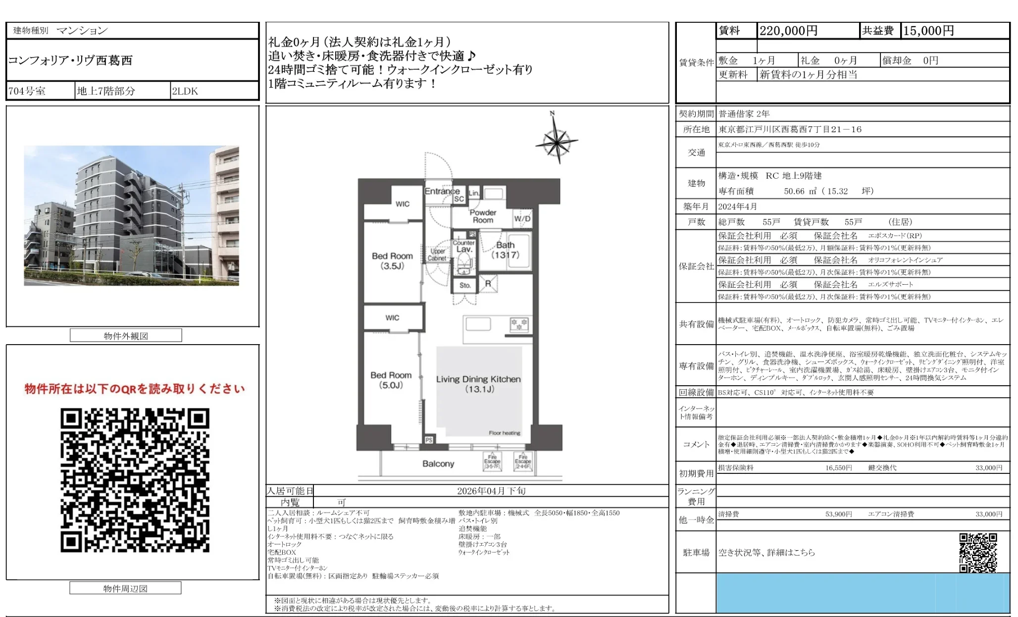 | 物件名 | コンフォリア・リヴ西葛西 704号 |