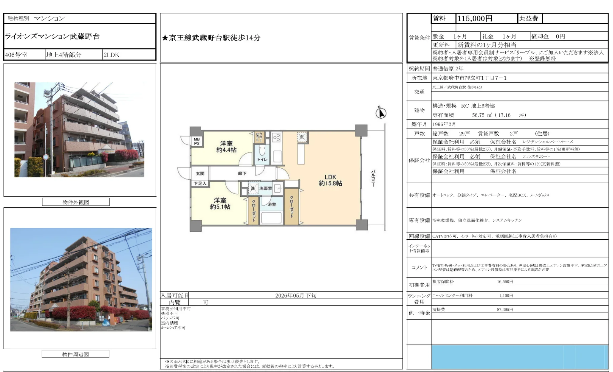 | 物件名 | ライオンズマンション武蔵野台 406号 |
