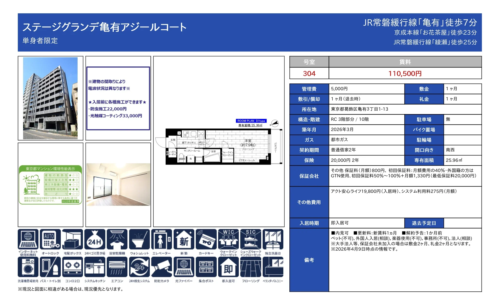 | 物件名 | ステージグランデ亀有アジールコート 304号 |