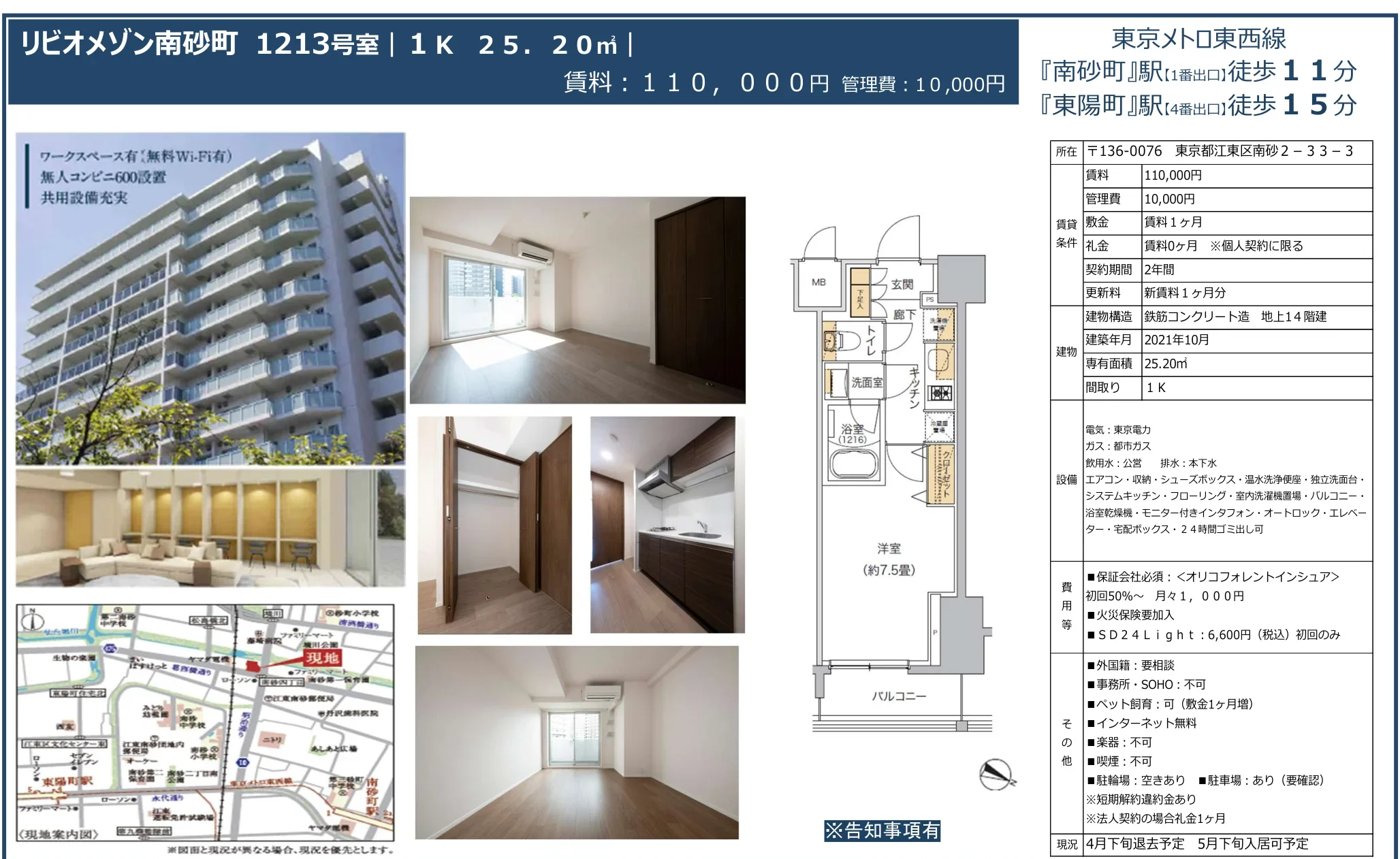 | 物件名 | リビオメゾン南砂町 1213号 |