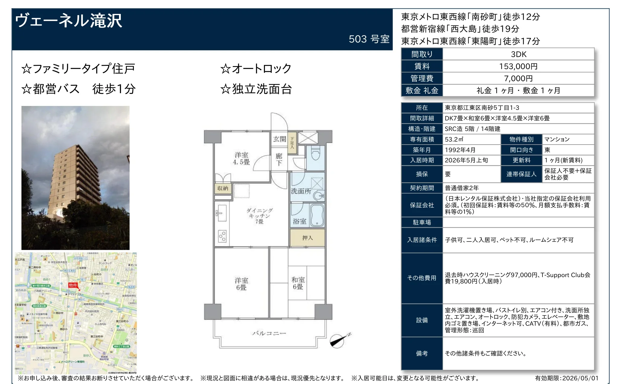 | アクセス | 東陽町 (徒歩17分) 南砂町 (徒歩12分) 西大島 (徒歩19分) |