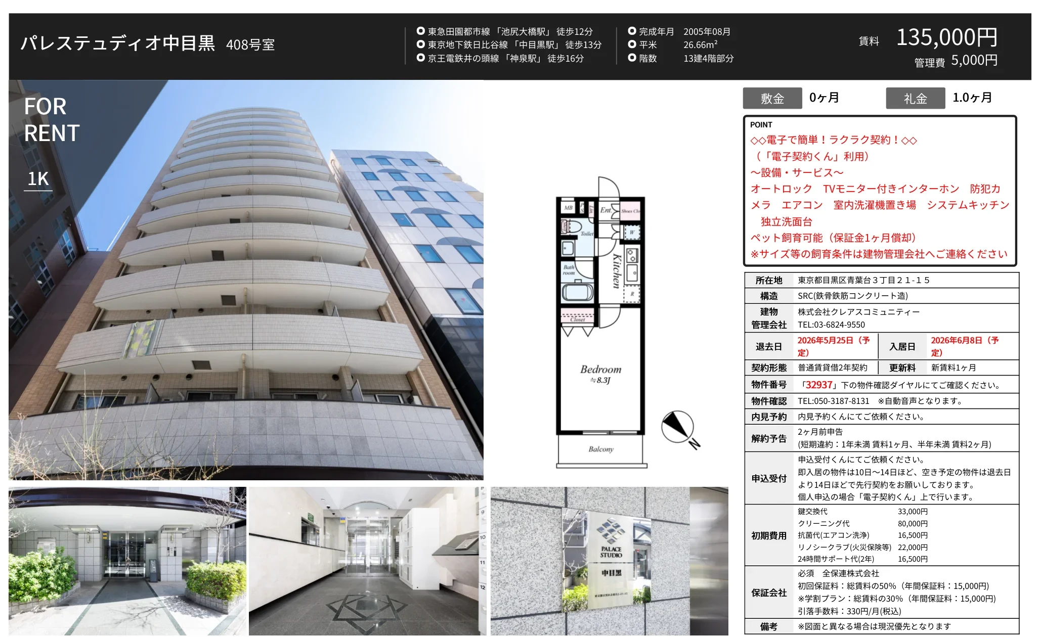 | 物件名 | パレステュディオ中目黒 408号室 408号 |