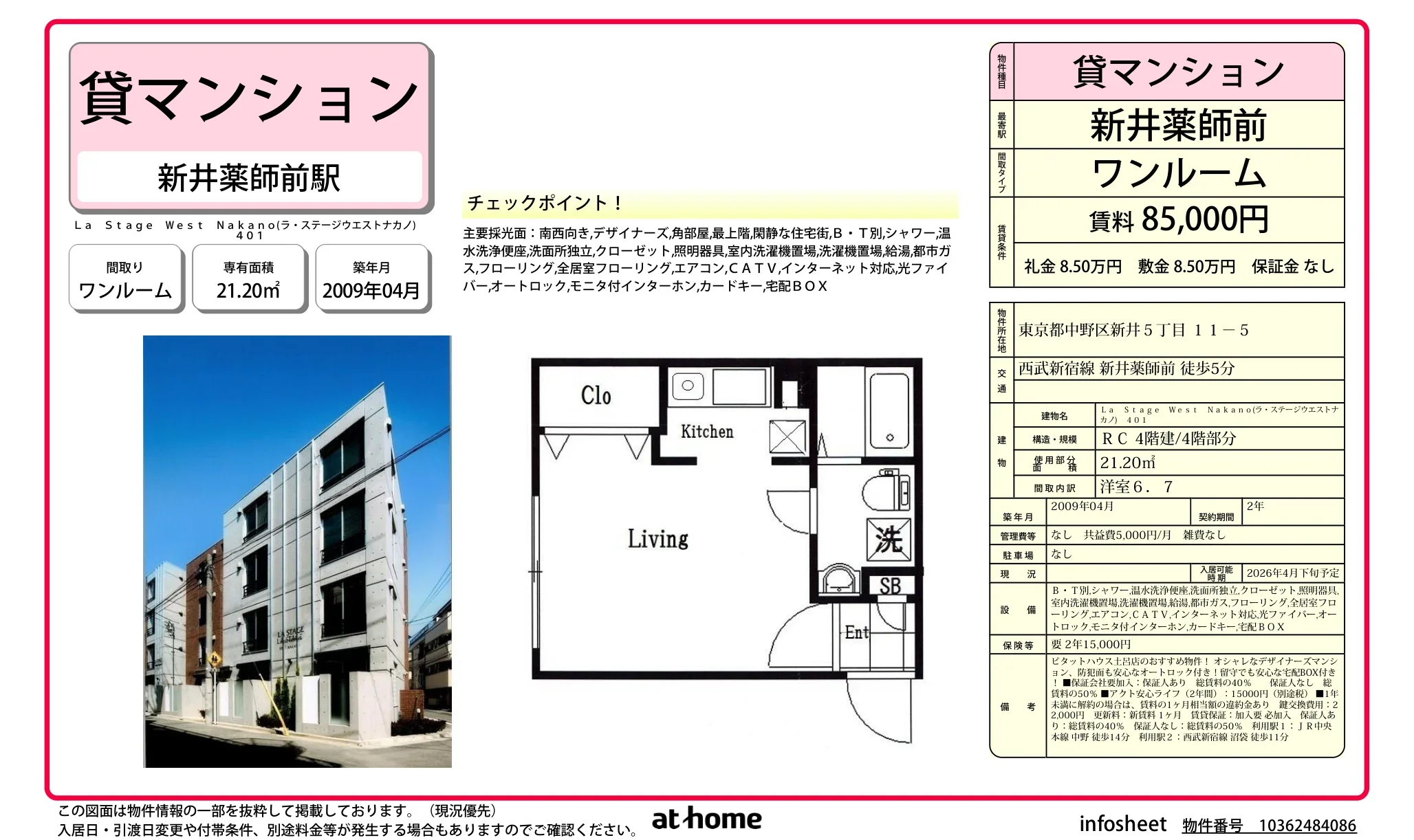 | 物件名 | La Stage West Nakano (ラ・ステージウエストナカノ) 401 401号 |