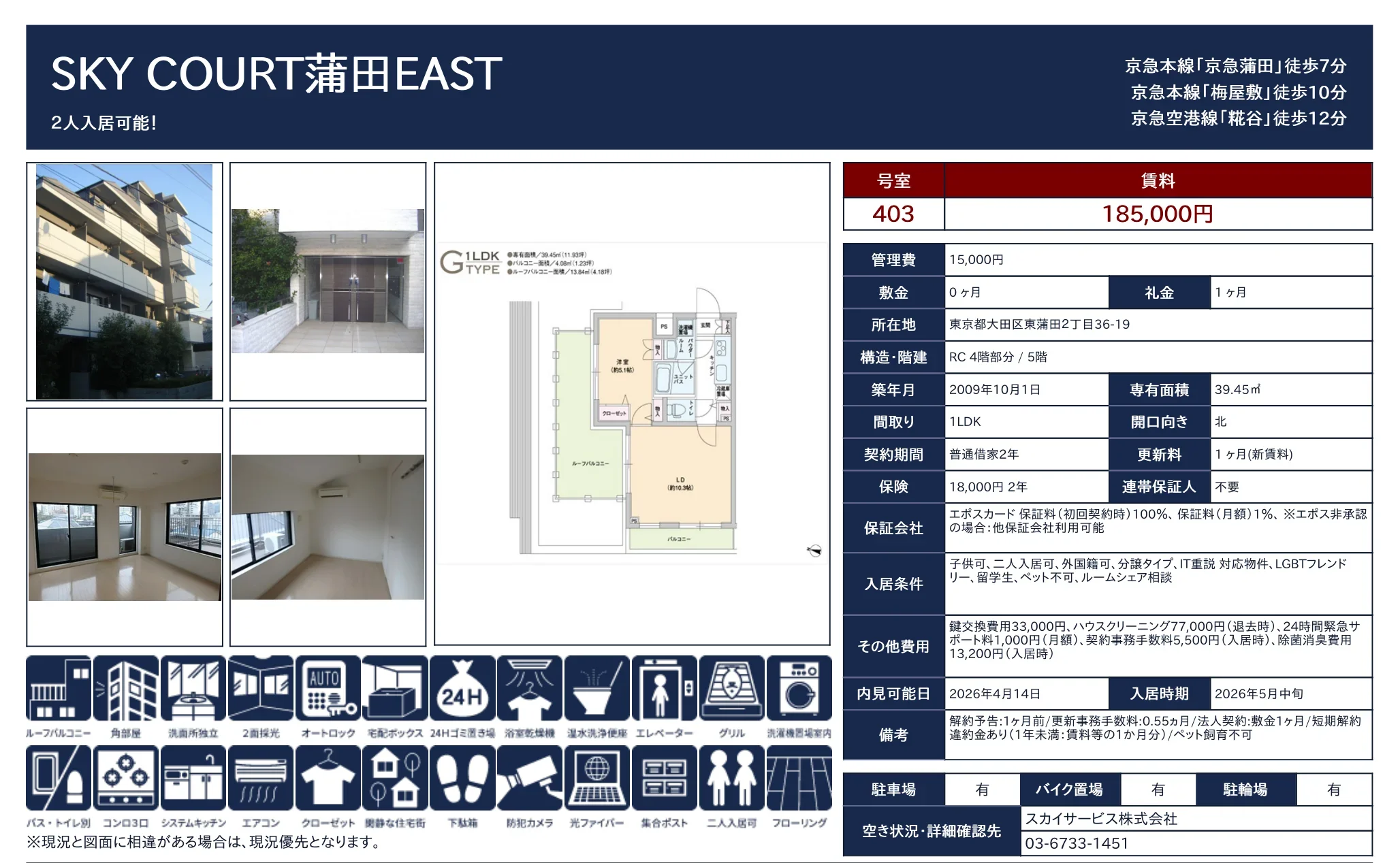 | 物件名 | スカイコート蒲田イースト 403号 |