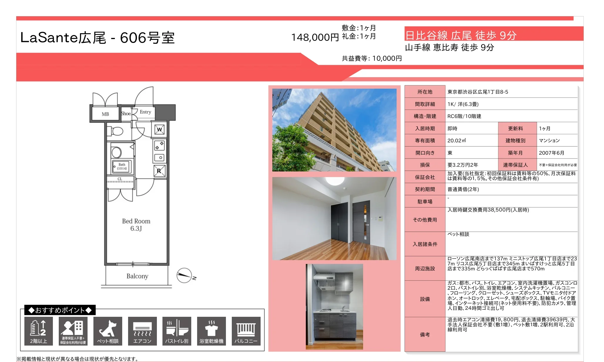 | 物件名 | LaSante 広尾 606号室 606号 |