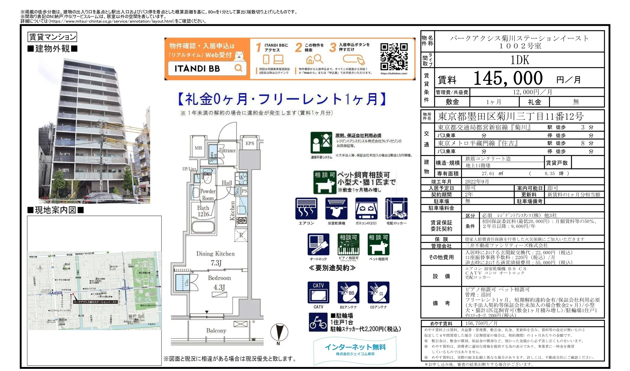 | 物件名 | パークアクシス菊川ステーションイースト 1002号 |