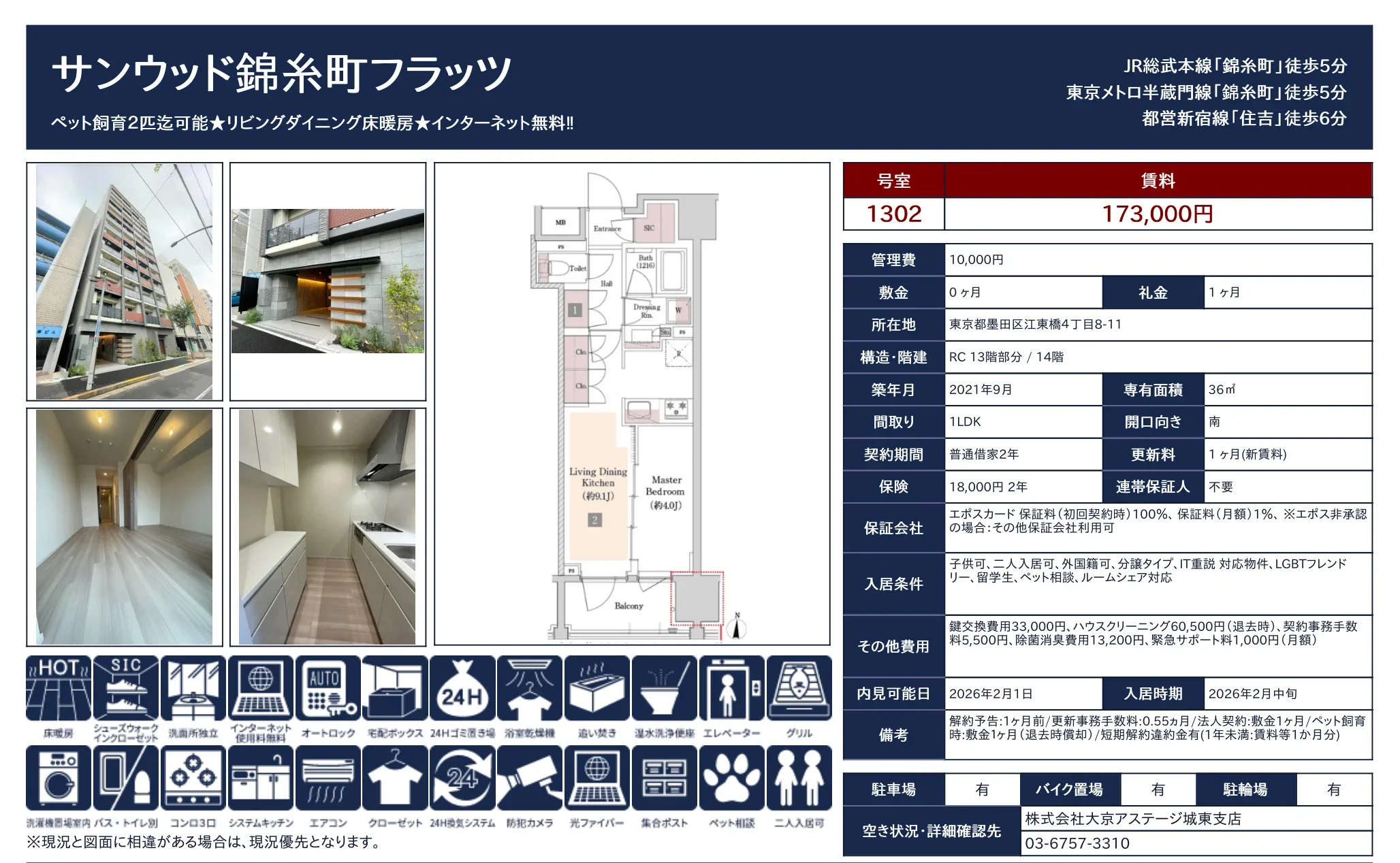 | 物件名 | サンウッド錦糸町フラッツ 1302号 |
