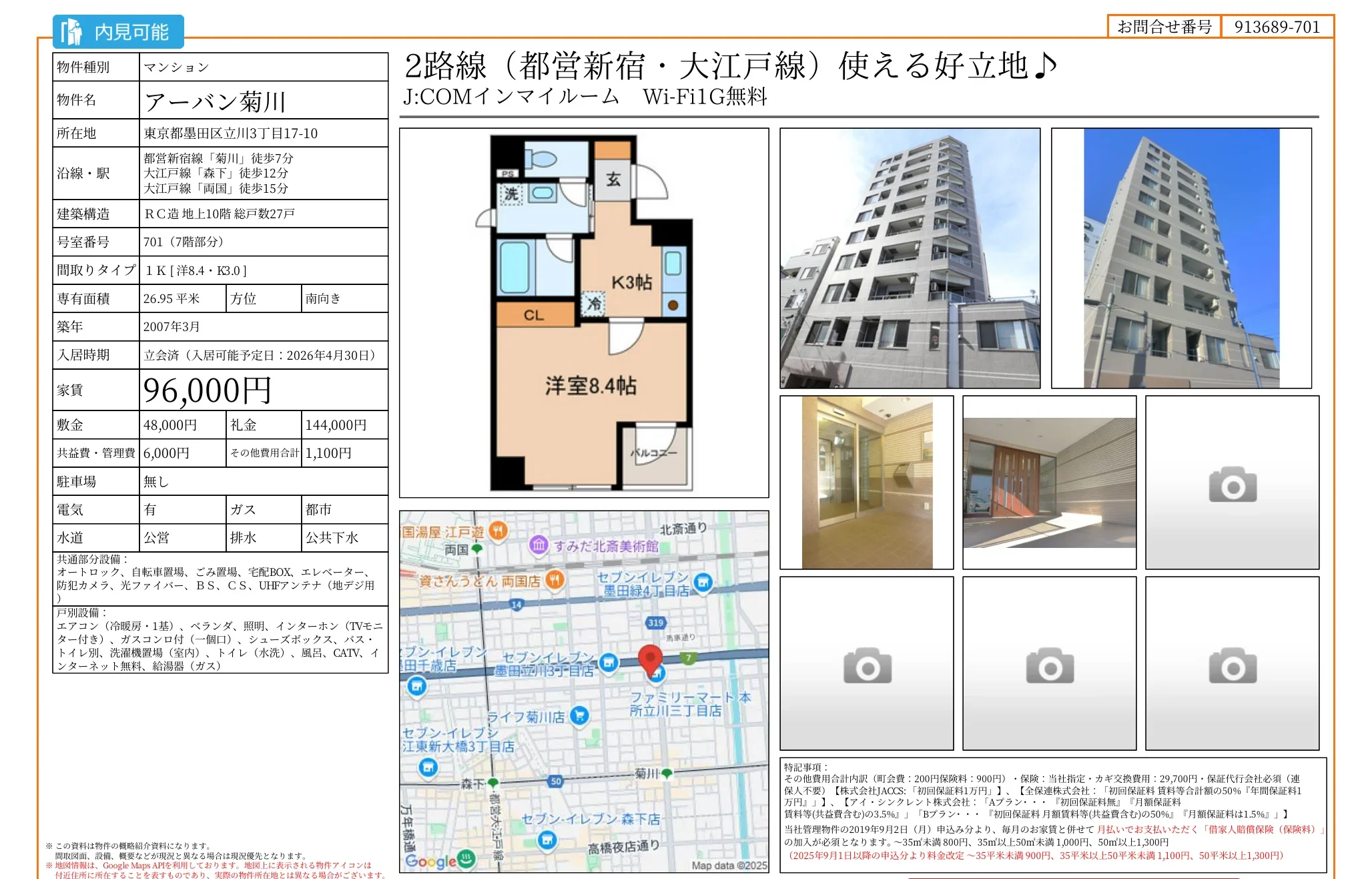 | アクセス | 菊川 (徒歩7分) 森下 (徒歩12分) 両国 (徒歩15分) |