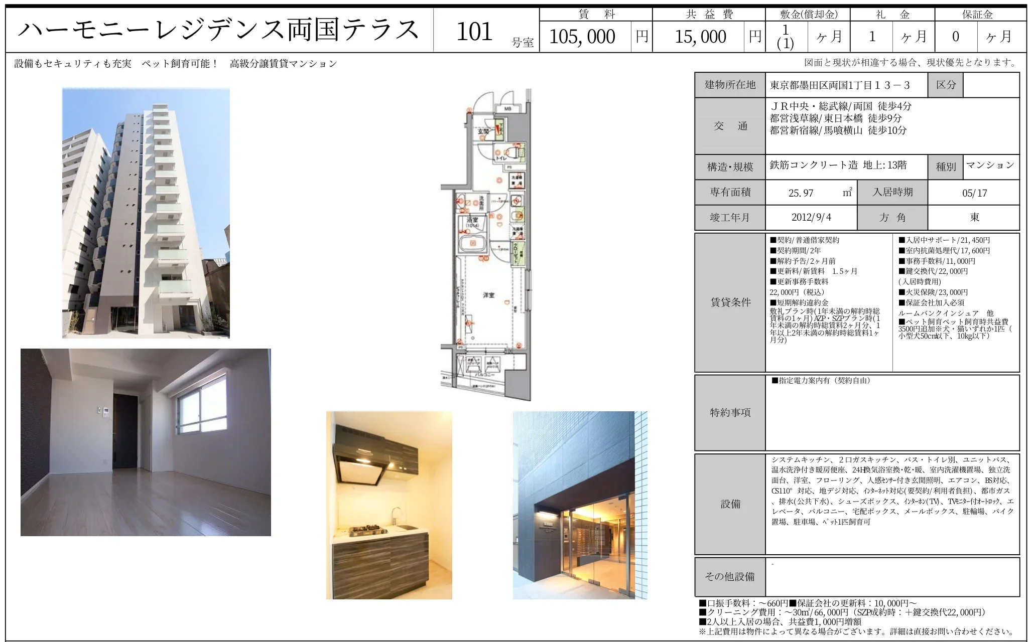| 物件名 | ハーモニーレジデンス両国テラス 101 101号 |