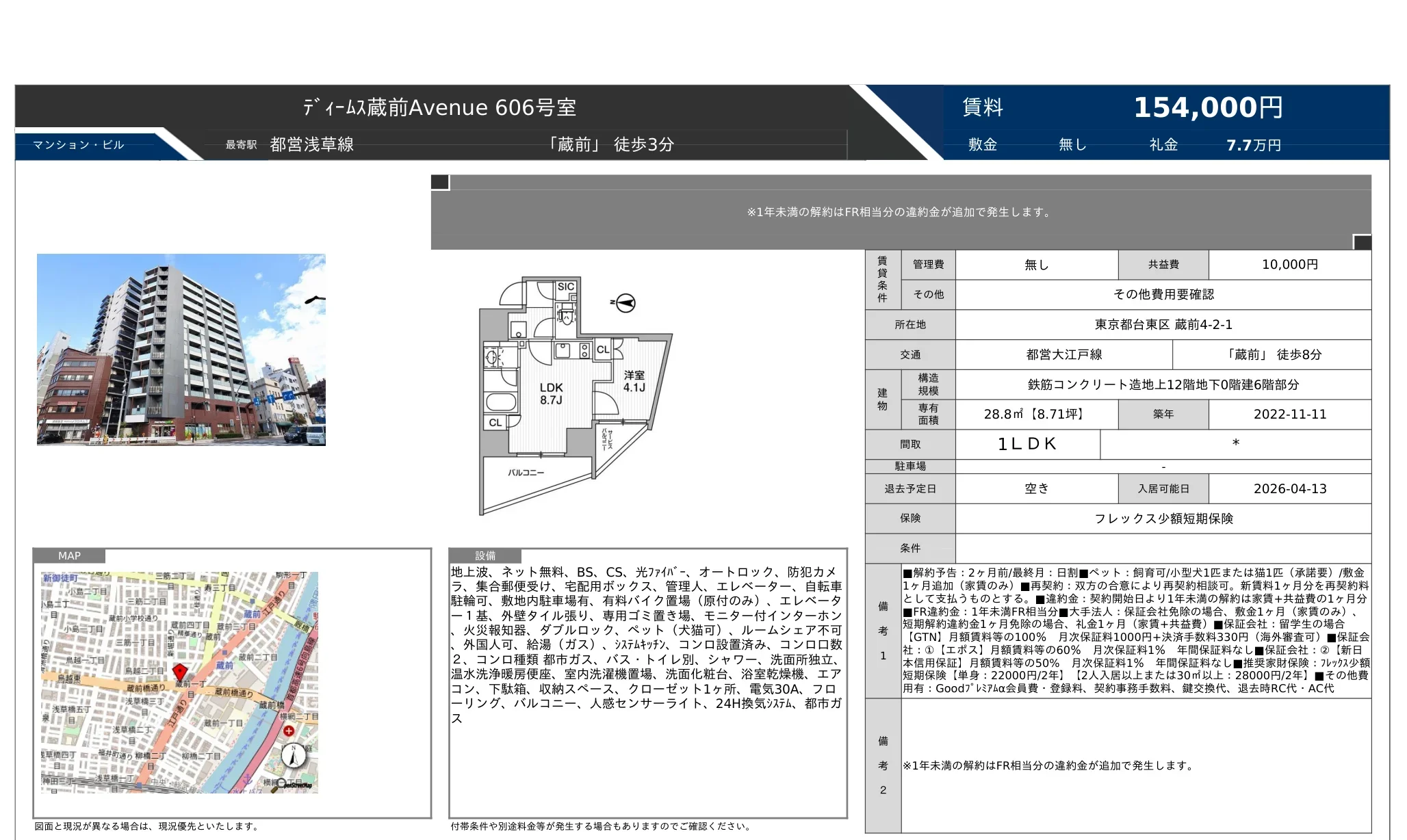 | 物件名 | ディーム蔵前Avenue 606号 |
