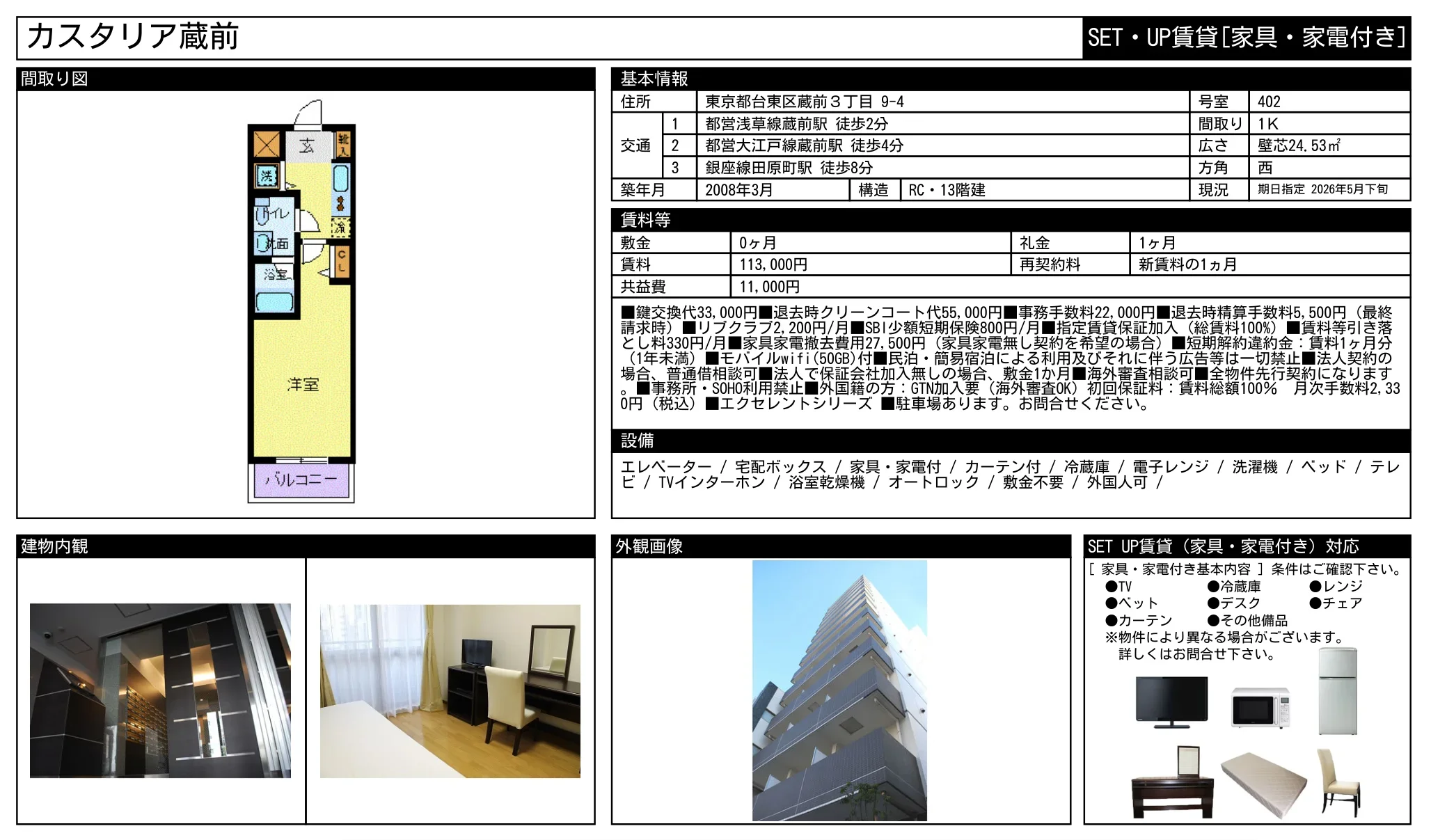 | 物件名 | SET・UP賃貸 [家具・家電付き] カスタリア蔵前 402号 |