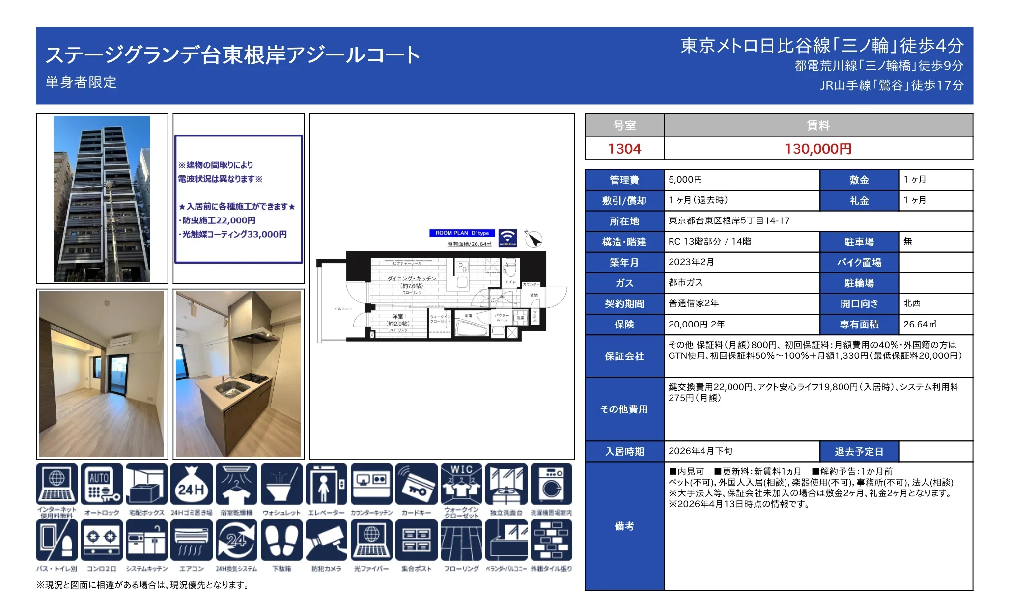 | 物件名 | ステージグランデ台東根岸アジールコート 1304号 |