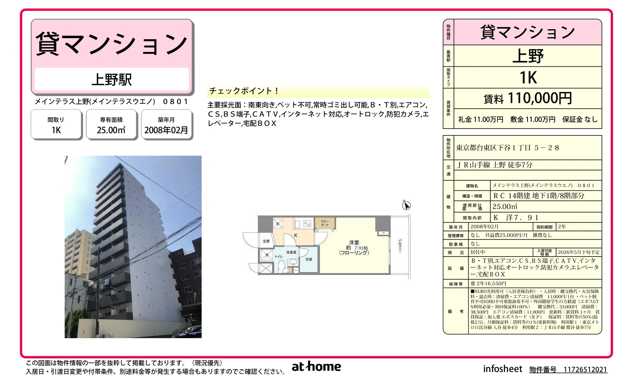| 物件名 | メインテラス上野 0801 |