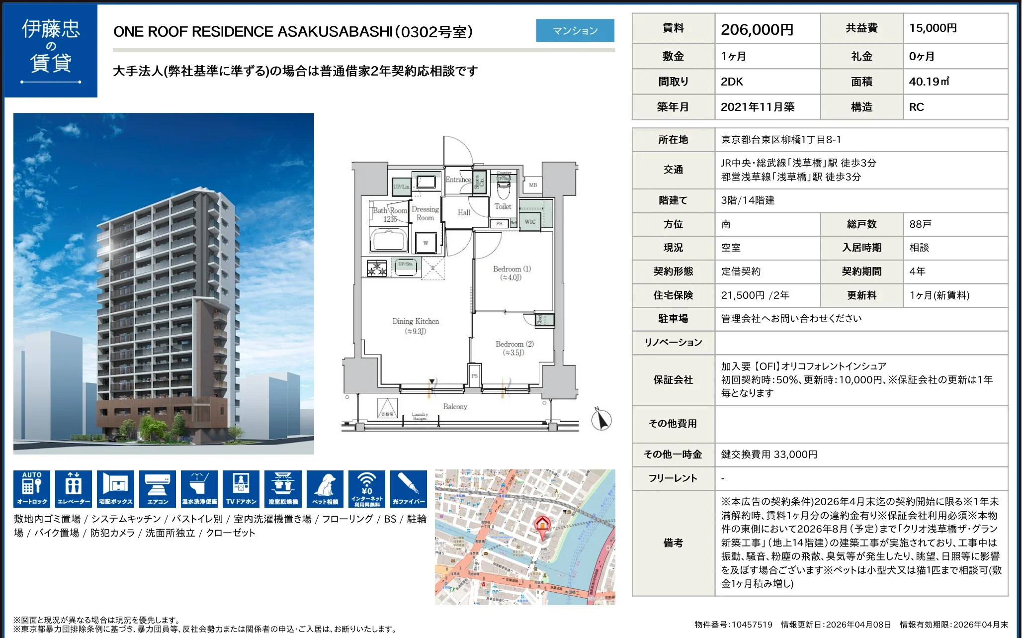 | 物件名 | ワンルーフレジデンス浅草橋 0302号 |