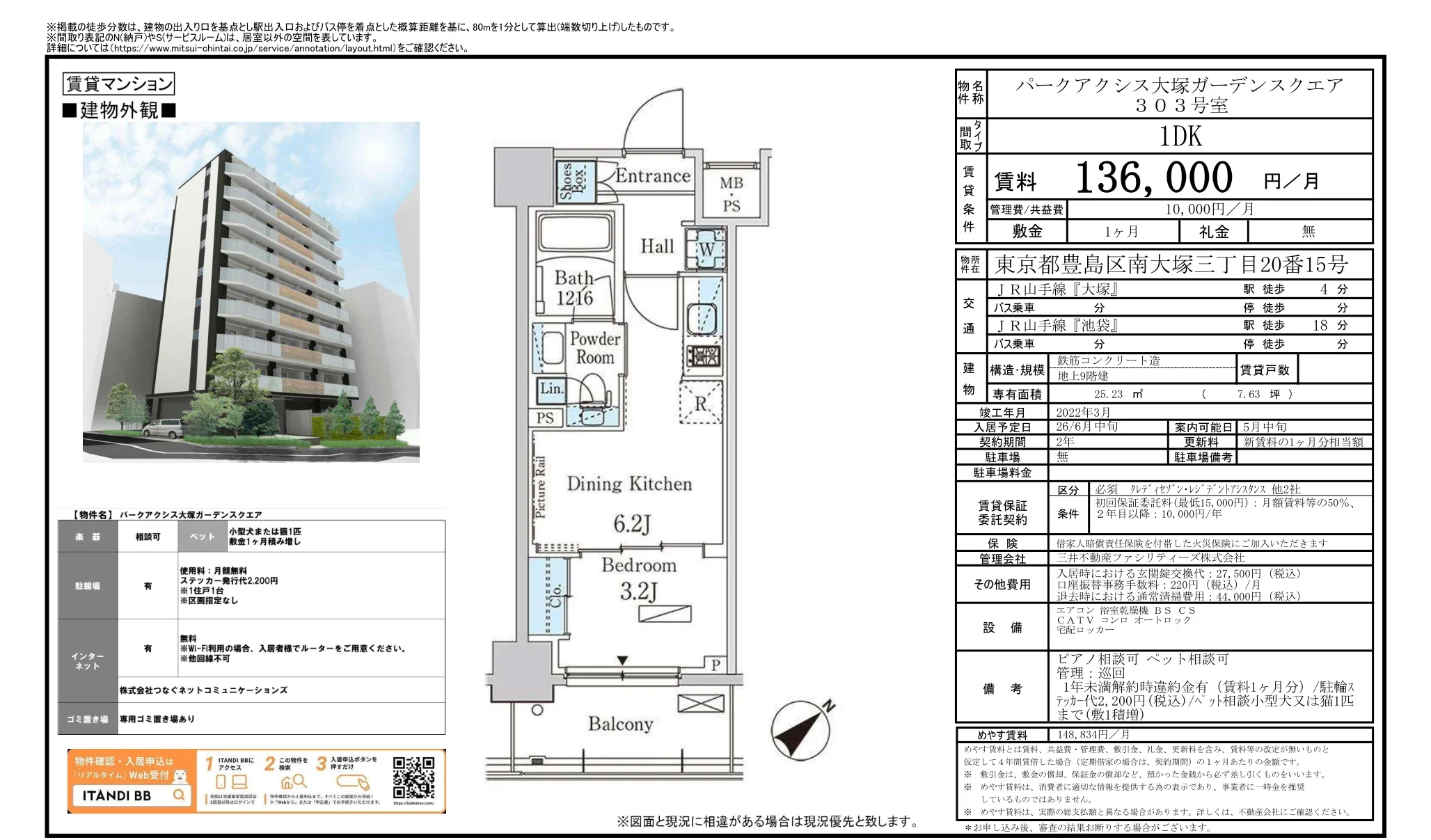| 物件名 | パークアクシス大塚ガーデンスクエア 303号 |